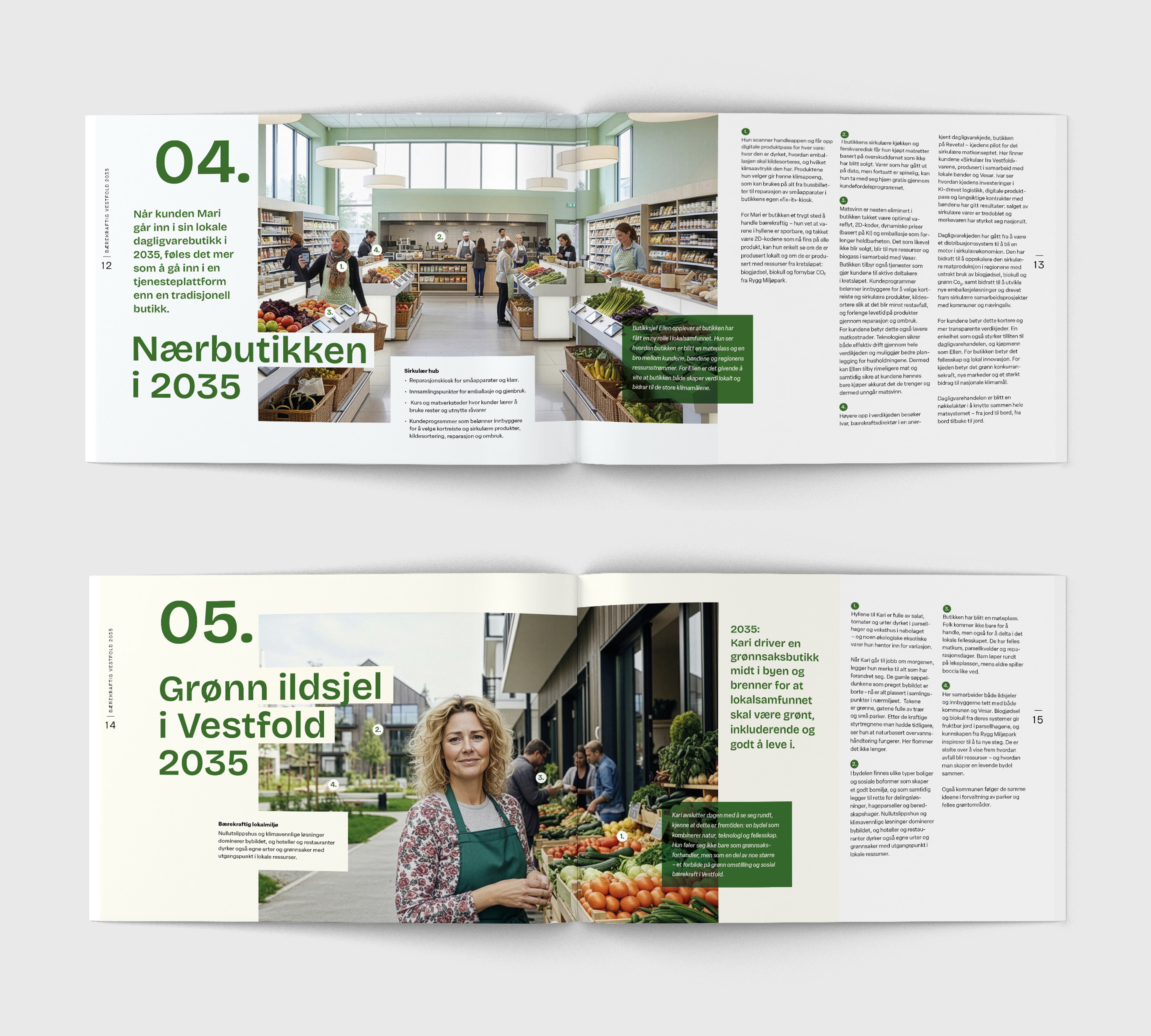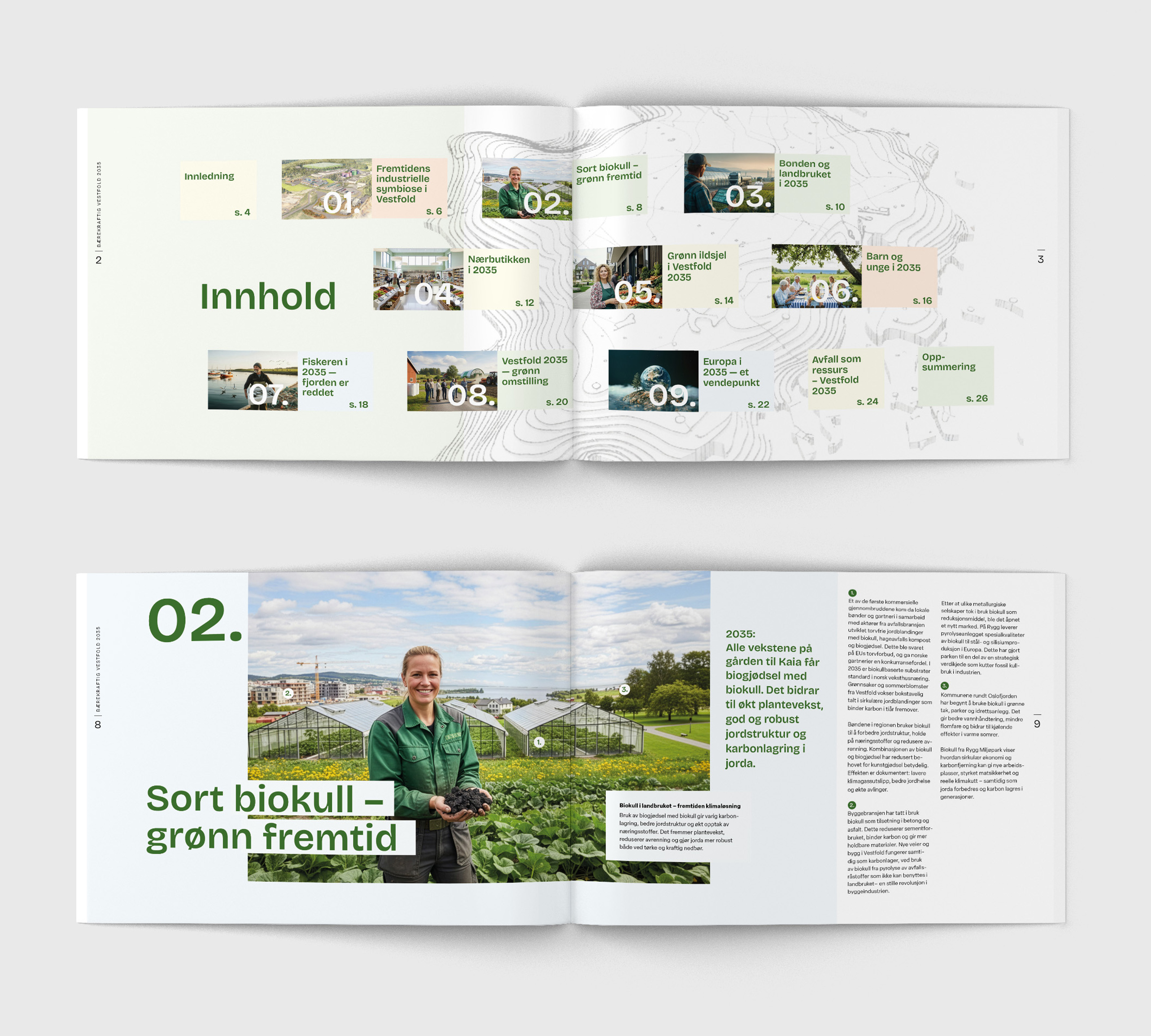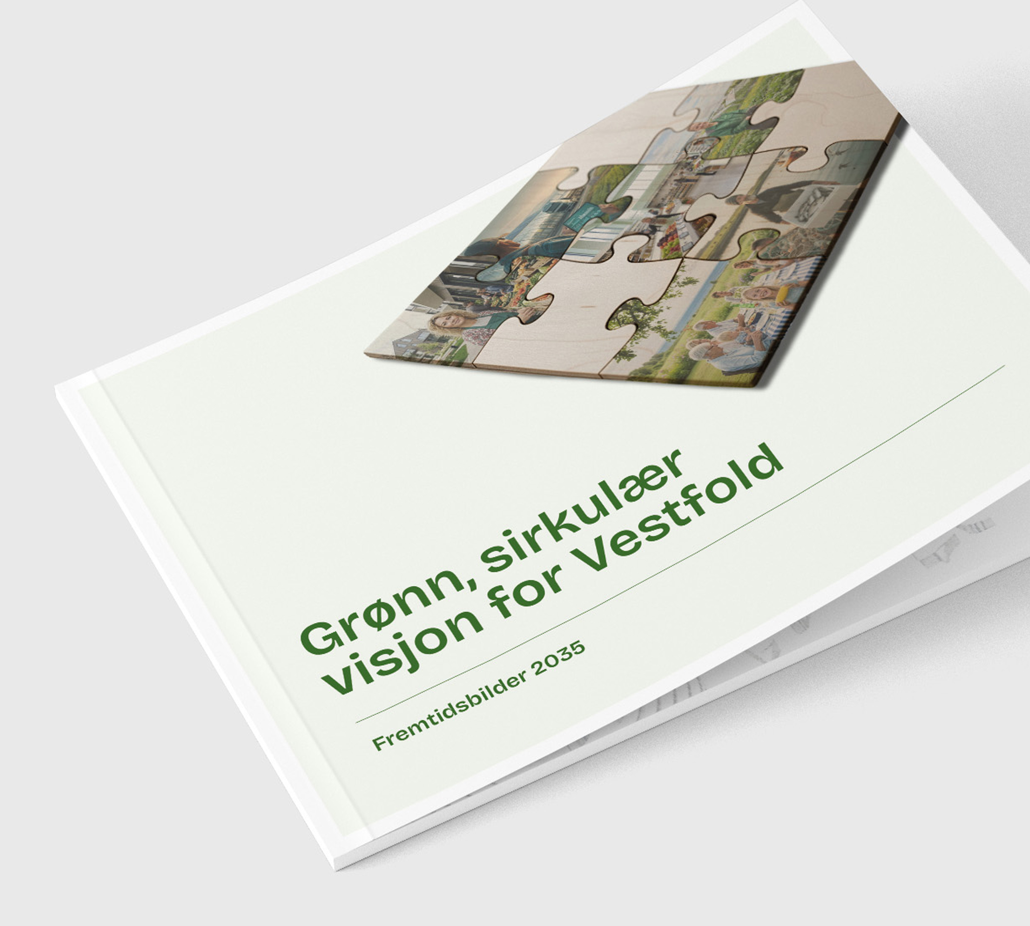 Design og produksjon av et 28-siders hefte som beskriver fremtidsvisjoner for Vestfold og sirkulær økonomi. Utfordringen var å skape troverdige bilde-tablåer av en fremtid som ennå ikke finnes og her tok vi bruk av AI.